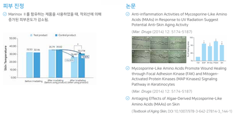 MARINOX Ⅱ: 임상시험을 통해 주름개선 및 피부온도 26.08% 감소 (피부진정효과) 뿐 아니라 피부세포에 독성이 없으면서도 상처치유,피부재생 및 탄력개선에 도움을 줍니다
